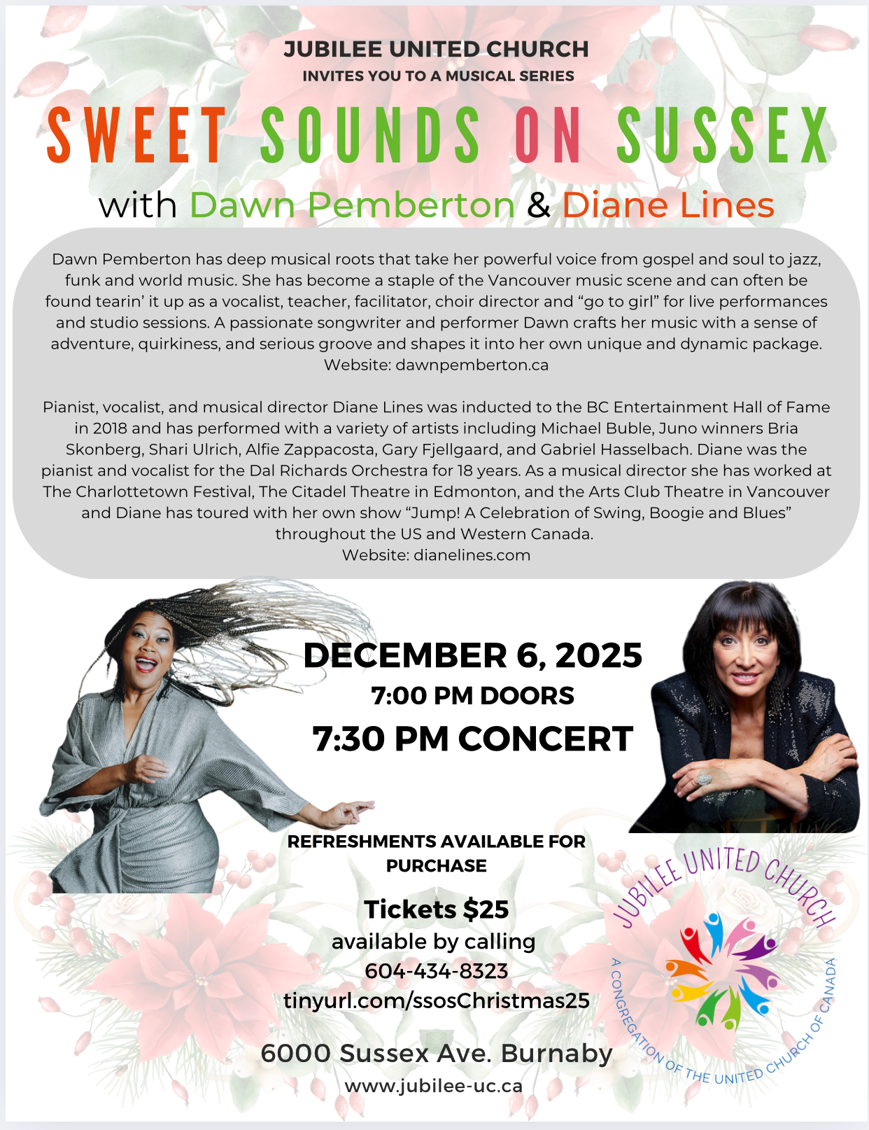 Sweet Sounds on Sussex By Office of Dawn P|2025-11-24T11:26:10-08:00November 24, 2025|News| Sweet Sounds on Sussex Dawn Pemberton and Diane Lines December 6th, 2025 Doors 7pm | Show 7:30pm Tickets: $25 available by calling 604-434-8323 or online here.
