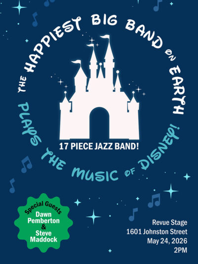 He’s also the director of the Happiest Big Band on Earth, a 17 piece Big Band that plays Jazz arrangements of your favourite Disney & Pixar Songs! They’ll be playing their first Vancouver show in 2 years at the Revue Stage on Granville Island on May 24, in a special concert that is open to ALL AGES!
